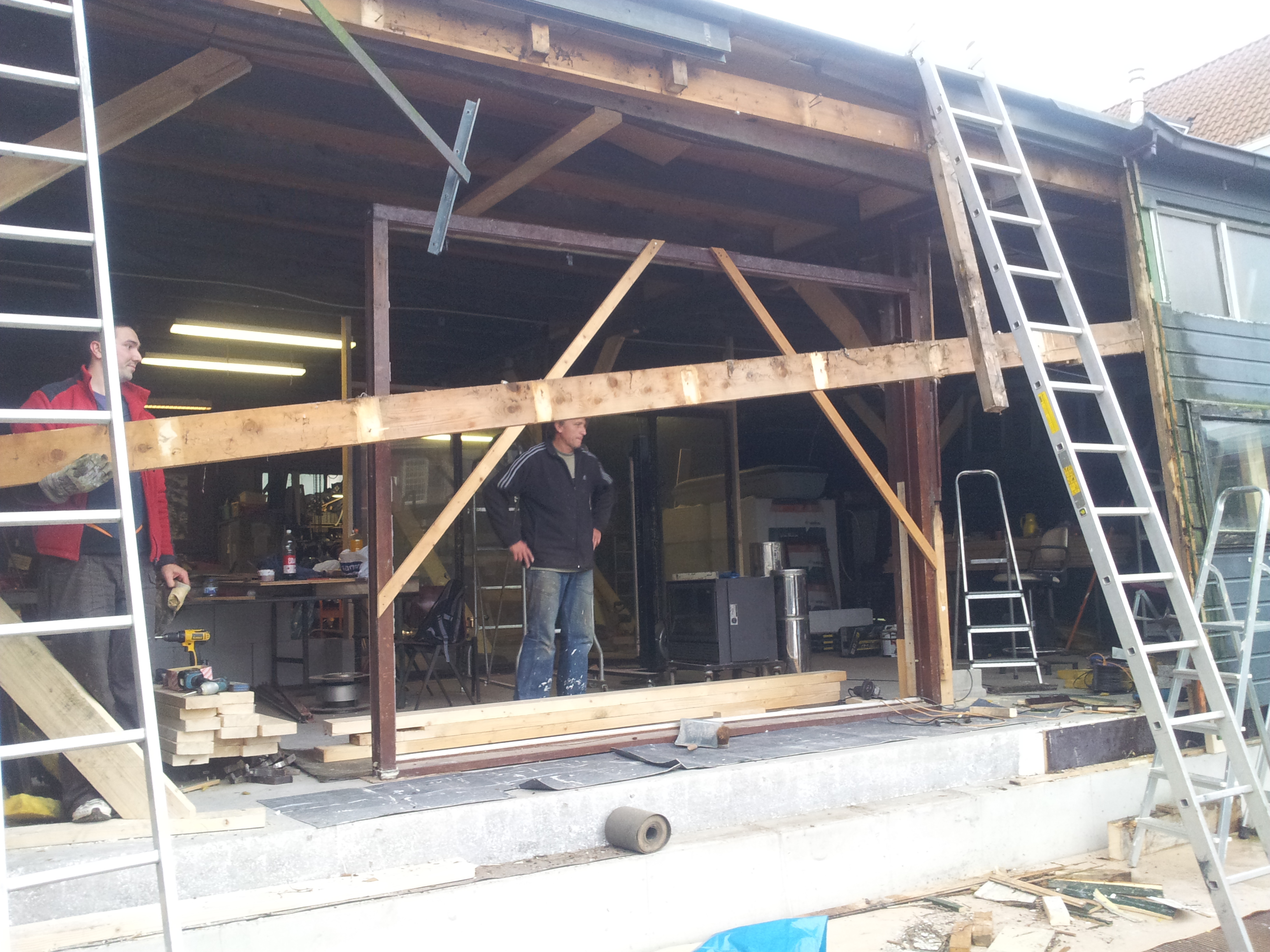 En dan plots is er geen Noordgevel meer. De oude rabatdelen (planken) worden zoveel mogelijk hergebruikt. Als een razende moet de nieuwe wand weer opgebouwd worden, want maandag is er storm voorspeld….