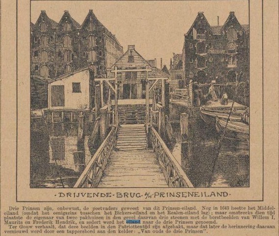 Waar nu de “3 Haringen” ophaalbrug staat, lag vroeger een drijvende overloop “Kippenbrug” (publ. 1907). Rechts het terreintje waar nu de Botenclub is gevestigd. Daarachter de pakhuizen de “Drie Prinsen” (nu “Markus”) en links de pakhuizen de “Drie Haringen” waarvan er 2 rond 1920 afbrandden.